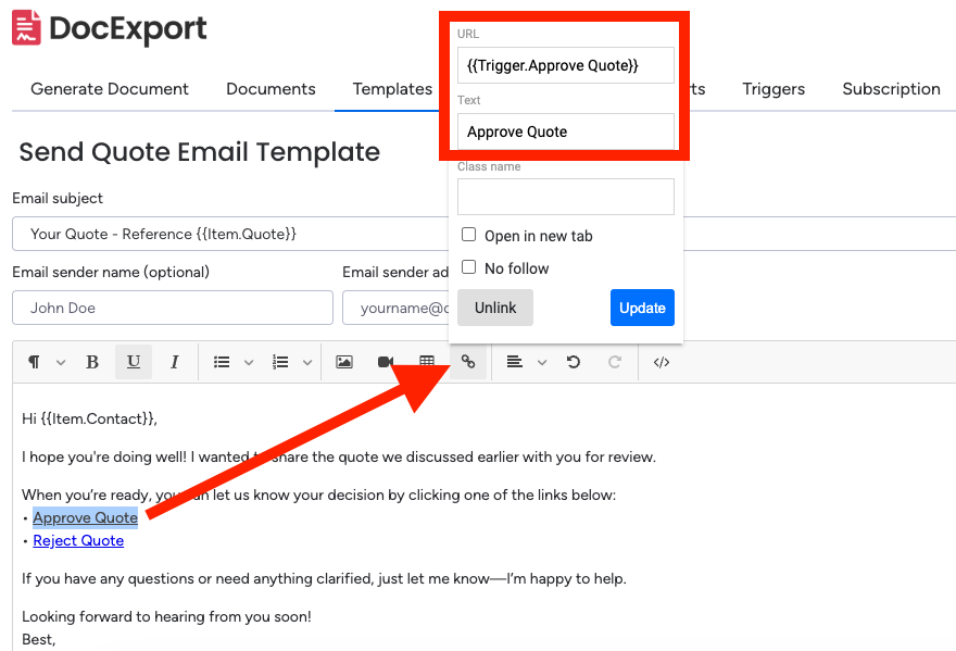 If you want to include a clickable button (for example, a trigger link) inside your DocExport email template, you can insert an HTML snippet directly into the email body. The button automatically adjusts its width based on the text you provide.