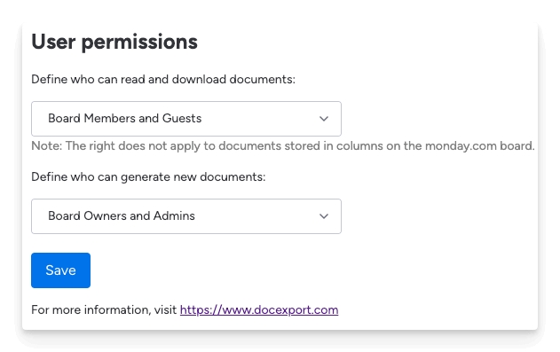 monday.com file columns are not part of the DocExport restriction. For example: if your item-level recipe saves a PDF to a file column and you want to restrict it to a specific user role, you need to restrict the column permissions via monday.com