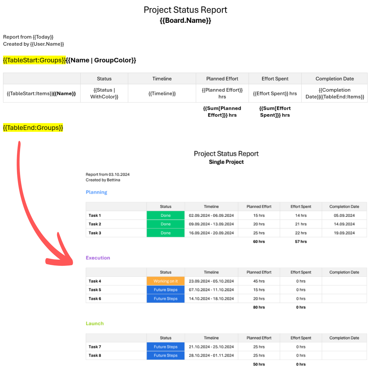 In many cases, you will have several groups within one monday board. If you use the placeholders as shown above, all items will be listed underneath one another, and won't be grouped like in your monday board.&#x20;