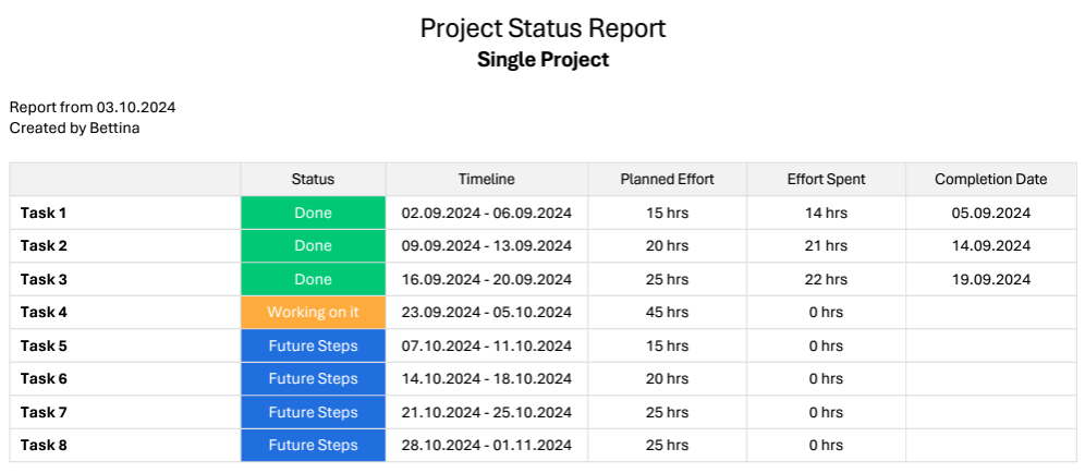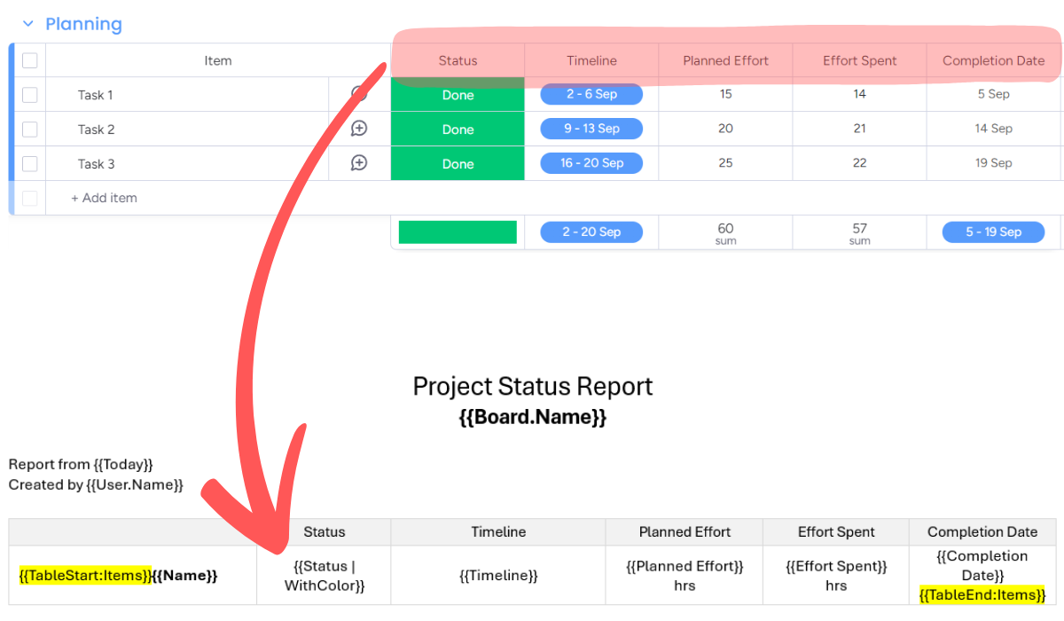When generating a Board Level document, the **entire board** or specific columns will be output as a **table**, including all items (rows).