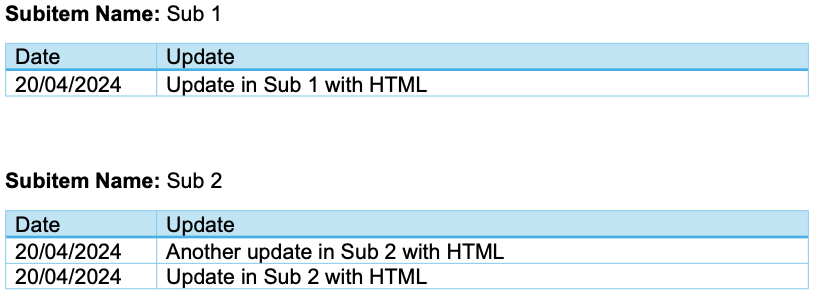 If you want to output the updates for all subitems as well, you can use the same logic, but wrap everything between {{TableStart:Subitems}} and {{TableEnd:Subitems}}