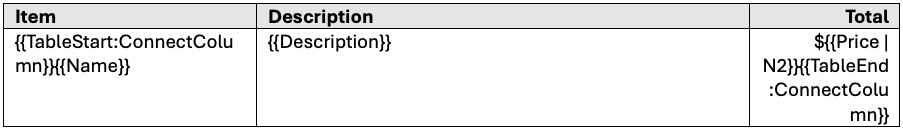 The second row (left column) needs to start with the placeholder {{TableStart:ConnectColumnTitle}} and ends (right column) with {{TableEnd:ConnectColumnTitle}}