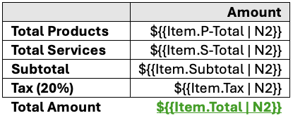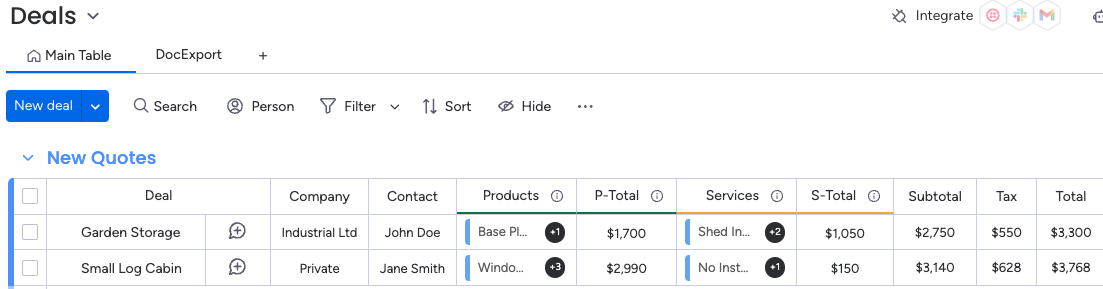 Products -> Connected to the 'Products Board' Services -> Connected to the 'Services Board' Subtotal -> Total of the Mirror Columns 'P-Total' and 'S-Total'. Total -> Formula Column which multiplies 'Subtotal' by 1.2 Tax -> Formula Column which subtracts Total-Subtotal