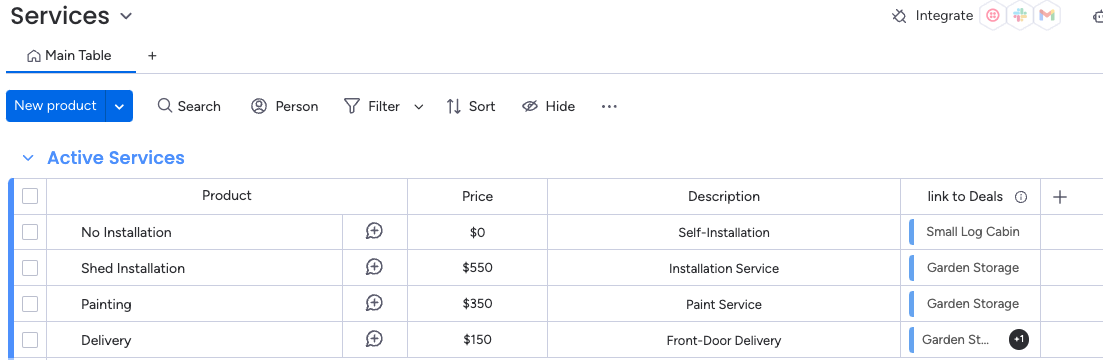 Example 2: You can create a Quote/Proposal and include services and products from connected 'Pricelist' boards.