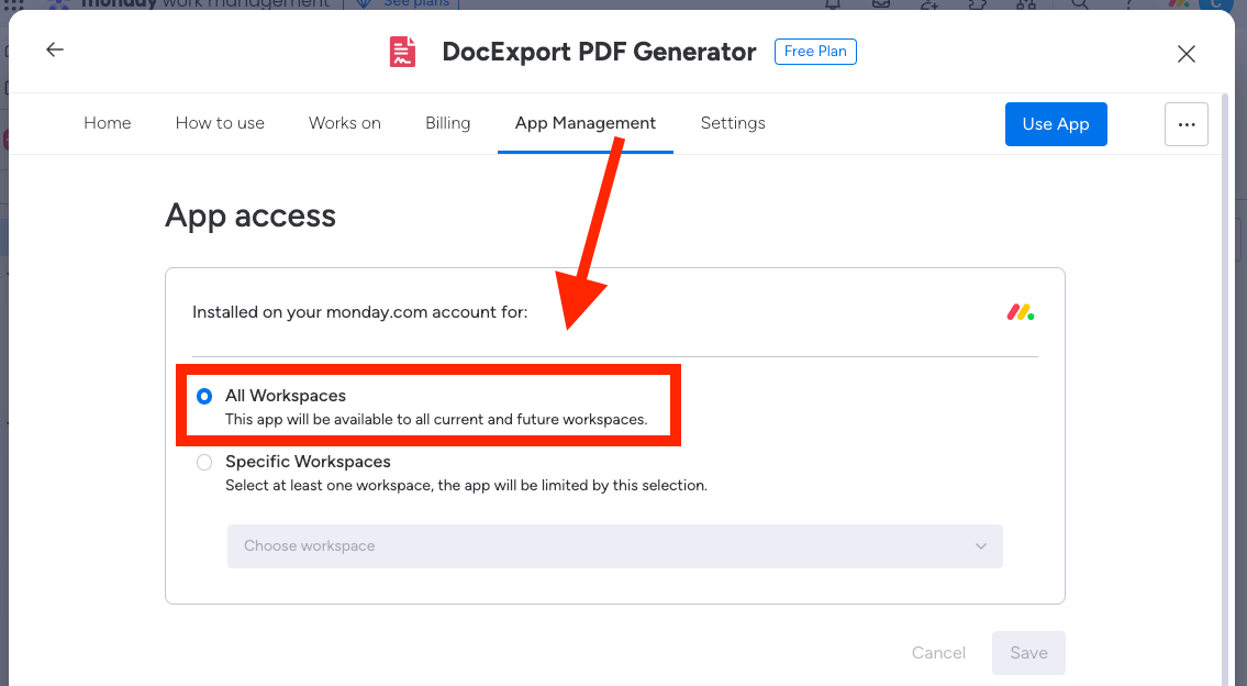 Click on the 'App Management' tab, select the 'All Workspaces' option and click on 'Save':